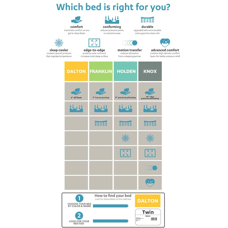 Our Dalton 6-inch all foam mattress conforms to the body in all the right places. High-density base foam relieves pressure points, hugs your body, and provides the essential support and comfort for a deeper night’s sleep. The textured, stretch knit fabric cover tops the foam interior for unbeatable comfort and reliability. Made in the USA.