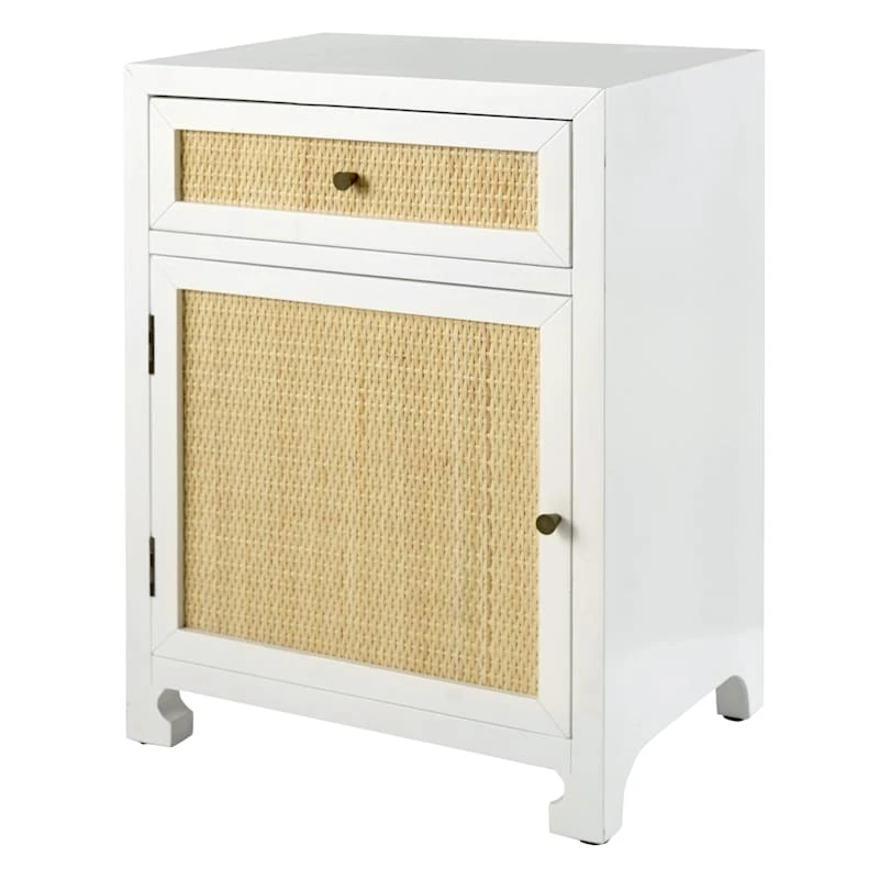 Bring the story of your home to life through one-of-a-pieces from the Grace Mitchell Collection by At Home. Even when space is limited, our Ellie Wood & Rattan Storage Cabinet fits right in and makes itself useful. Youâll love the fresh look of the cabinetâs simple (and versatile!) design featuring fresh white wood paired with rattanâs natural grain. Youâll find our delightful cabinet fits in anywhere and is designed to work as a nightstand, end table, or space-saving storage furniture.