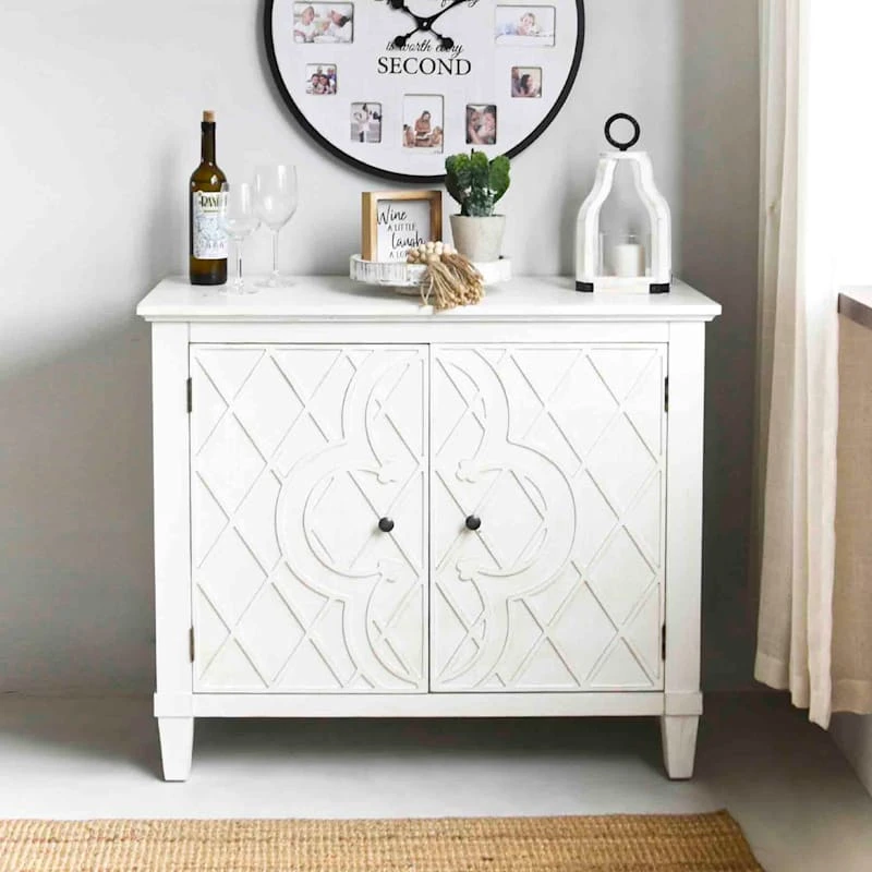 A collection that lets everyone relax in style. Polished finishes and classic hues pair with fun finds. Providence is where elegant settings still feel comfortable and warm�exclusively At Home. Our Coventry White Cross cabinet features a charming carved motif on the door panels that provide an elegant look to the room where this beautiful cabinet lands. The 2-door cabinet has large interior storage with shelves that could be useful to store easily accessible items and keep them put away and out of sight.